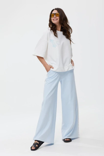 Футболка свободного силуэта. Выполнен из трикотажного полотна футер 2-х нитка.Вырез горловины овальной формы, обработан притачной бейкой. Рукав укороченный со спущенной линией плеча. Минималистичный, нежный принт прекрасно дополняет джемпер, а так же легко дополнит и украсит любой образ.
