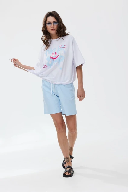 Футболка свободного силуэта, выполнена из кулирки. Вырез горловины овальной формы, обработан притачной бейкой. Перед с кулисой и шнуром, который позволяет регулировать ширину изделия. По переду изделия расположена яркая печать, которая не оставит Вас без внимания.