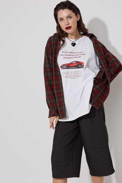 Футболка в стиле oversize свободного силуэта со спущенной линией плеча. Выполнена из трикотажного полотна кулирка. Вырез горловины овальной формы. Рукава втачные, одношовные. На футболку нанесена стильная дизайнерская печать. Модель one size.