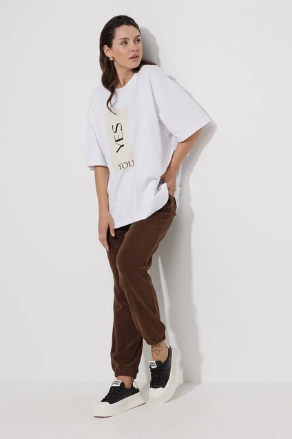 Футболка в стиле oversize свободного силуэта со спущенной линией плеча. Выполнена из трикотажного полотна кулирка. Вырез горловины овальной формы. Рукава втачные, одношовные. На футболку нанесена лаконичная печать. Модель one size.