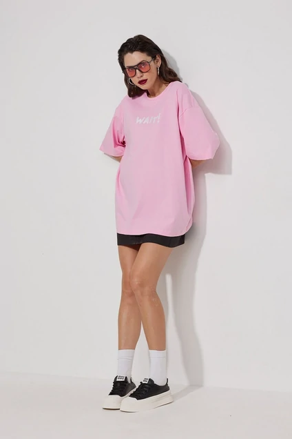Футболка в стиле oversize свободного силуэта со спущенной линией плеча. Выполнена из трикотажного полотна кулирка. Вырез горловины овальной формы. Рукава втачные, одношовные. Перед и спинка изделия дополнены дизайнерскими печатями. Модель one size.
