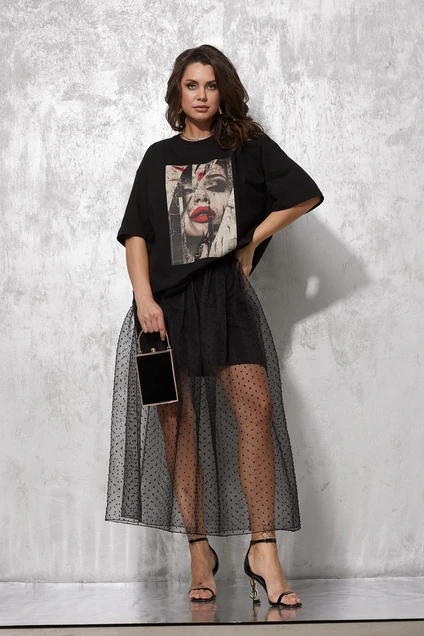 Футболка из трикотажного полотна кулирка в черном цвете — это стильный и универсальный элемент гардероба. Спущенная линия плеча и втачные рукава добавляют девушке расслабленный и непринужденный вид. Такой крой позволяет легко комбинировать футболку с различными низами. Выполненная в стиле oversize, эта футболка обеспечивает максимальный комфорт и свободу движений, что делает ее идеальным выбором для кэжуал-луков. Акцентная печать на передней части создает выразительный элемент дизайна. Модель one size (42-52).