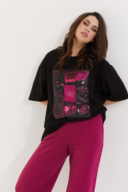 Футболка из трикотажного полотна кулирка в черном цвете с акцентной печатью по переду. Выполненная в стиле oversize, эта футболка обеспечивает максимальный комфорт и свободу движений, что делает ее идеальным выбором для кэжуал-луков. Спущенная линия плеча и втачные рукава сделают Ваш вид расслабленным и непринужденным. Модель one size (42-52).