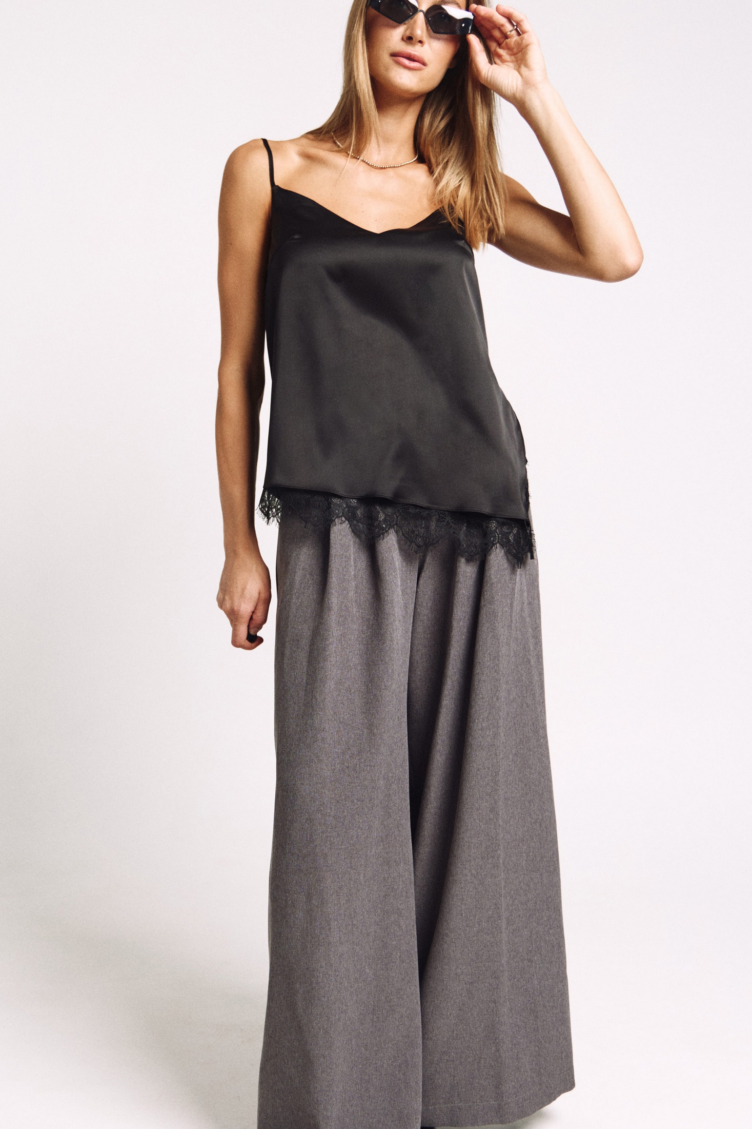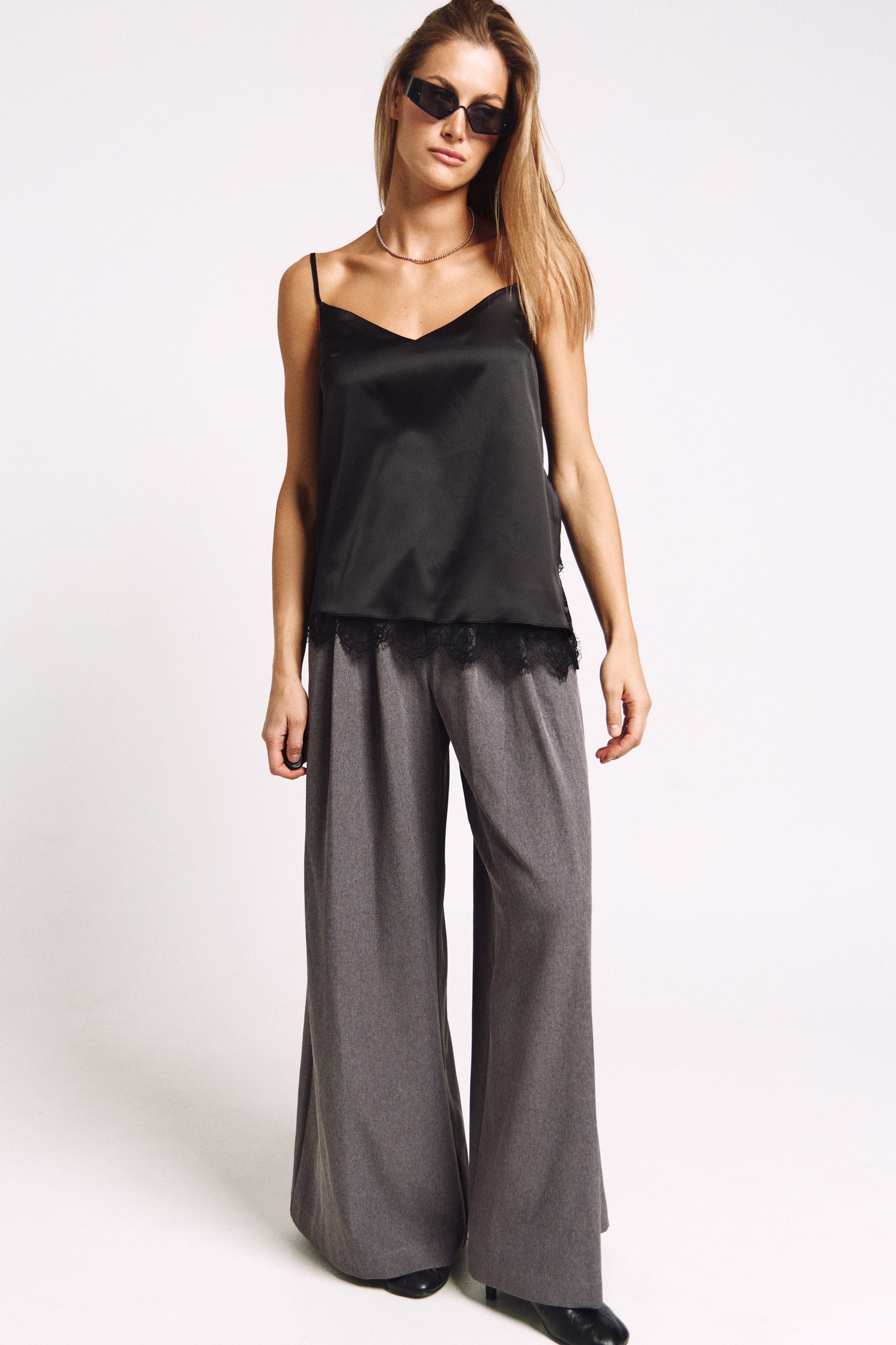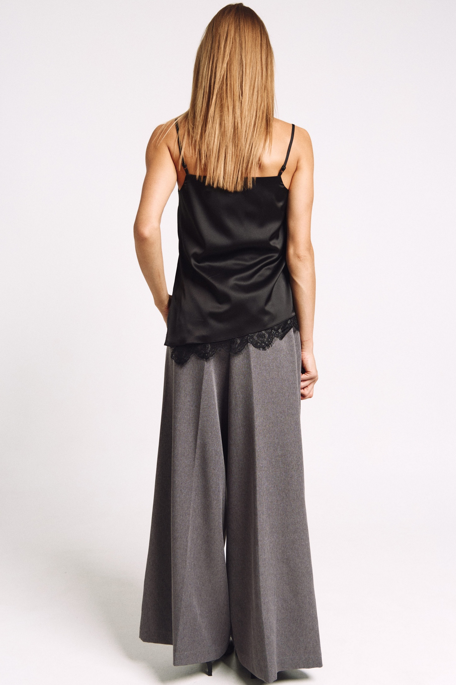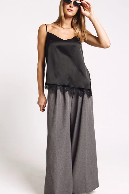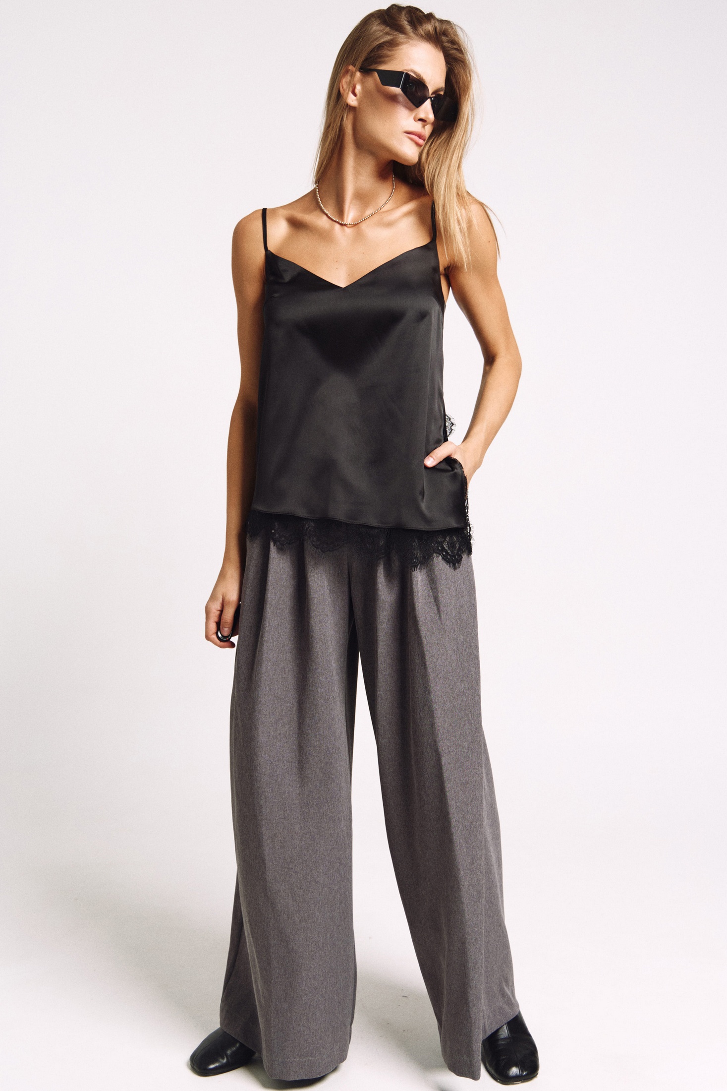 Топ-комбинация на подкладке. К подкладка притачано французское кружево. Асимметричный низ, разрез сбоку из которого видно кружево. Бретели регулируются.
