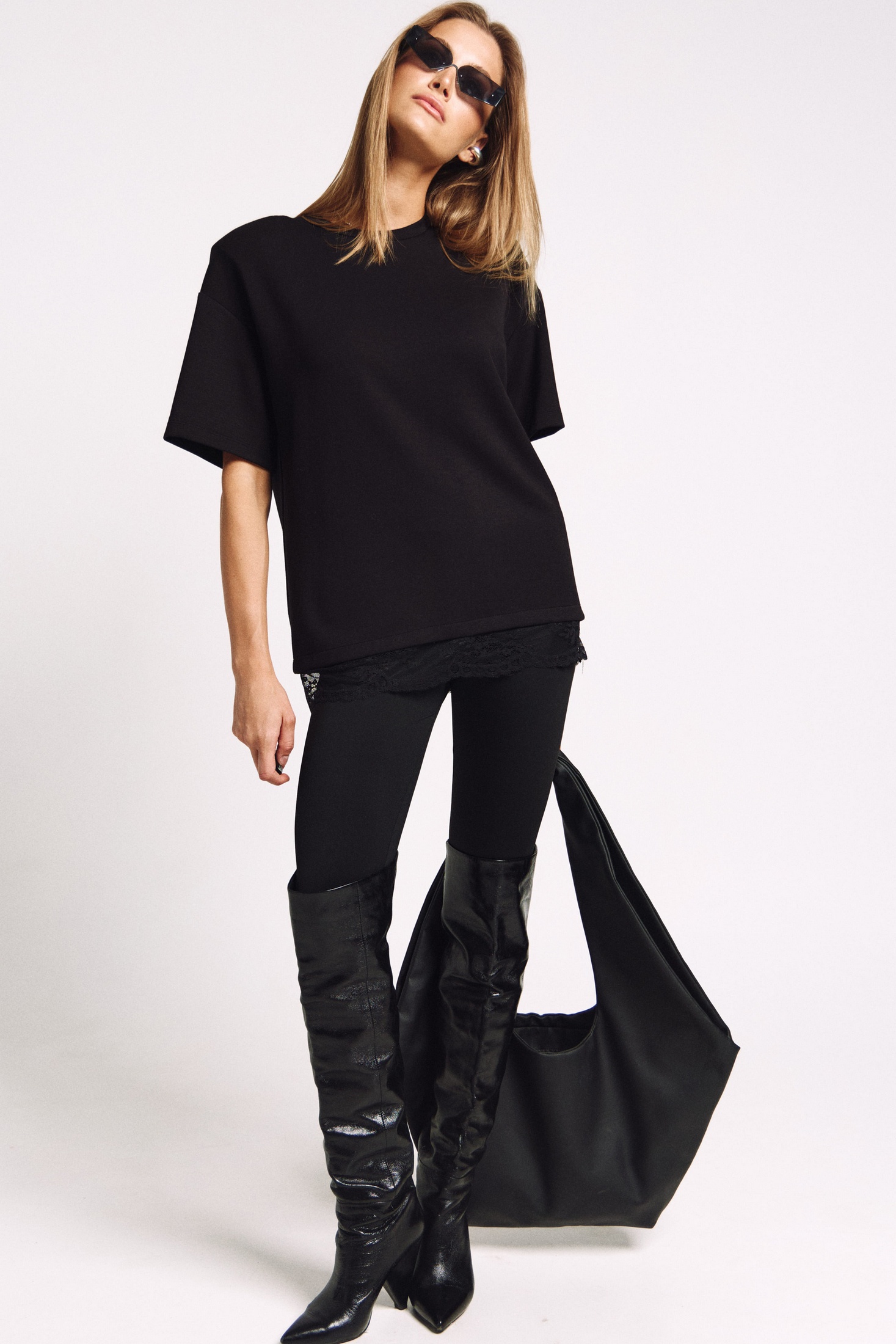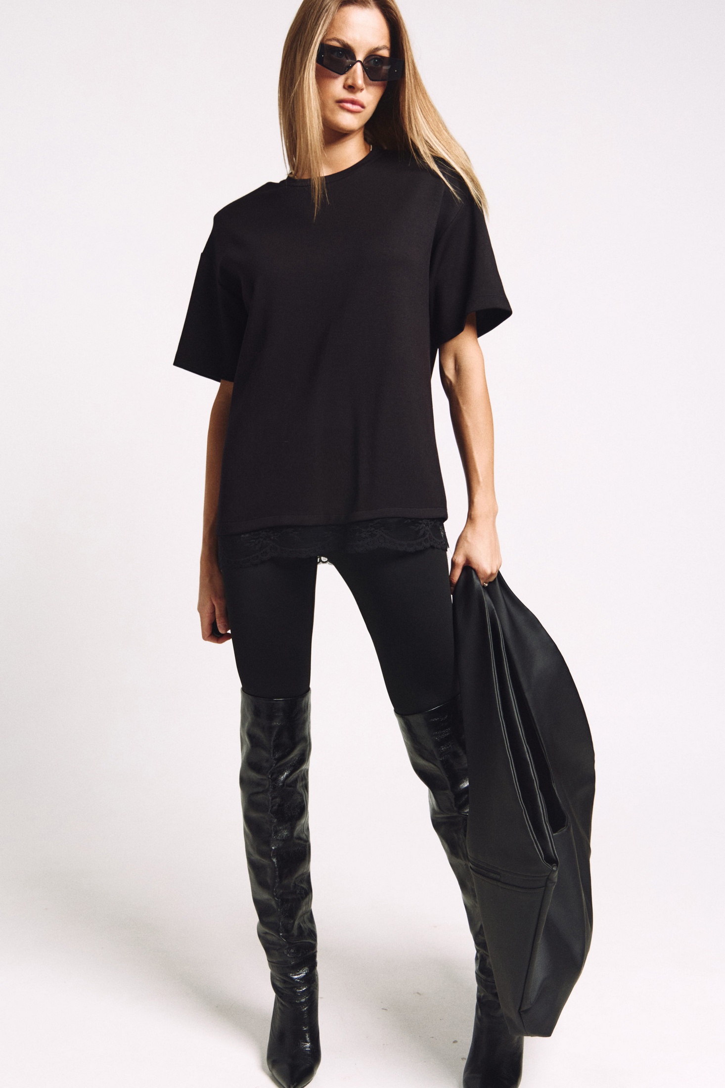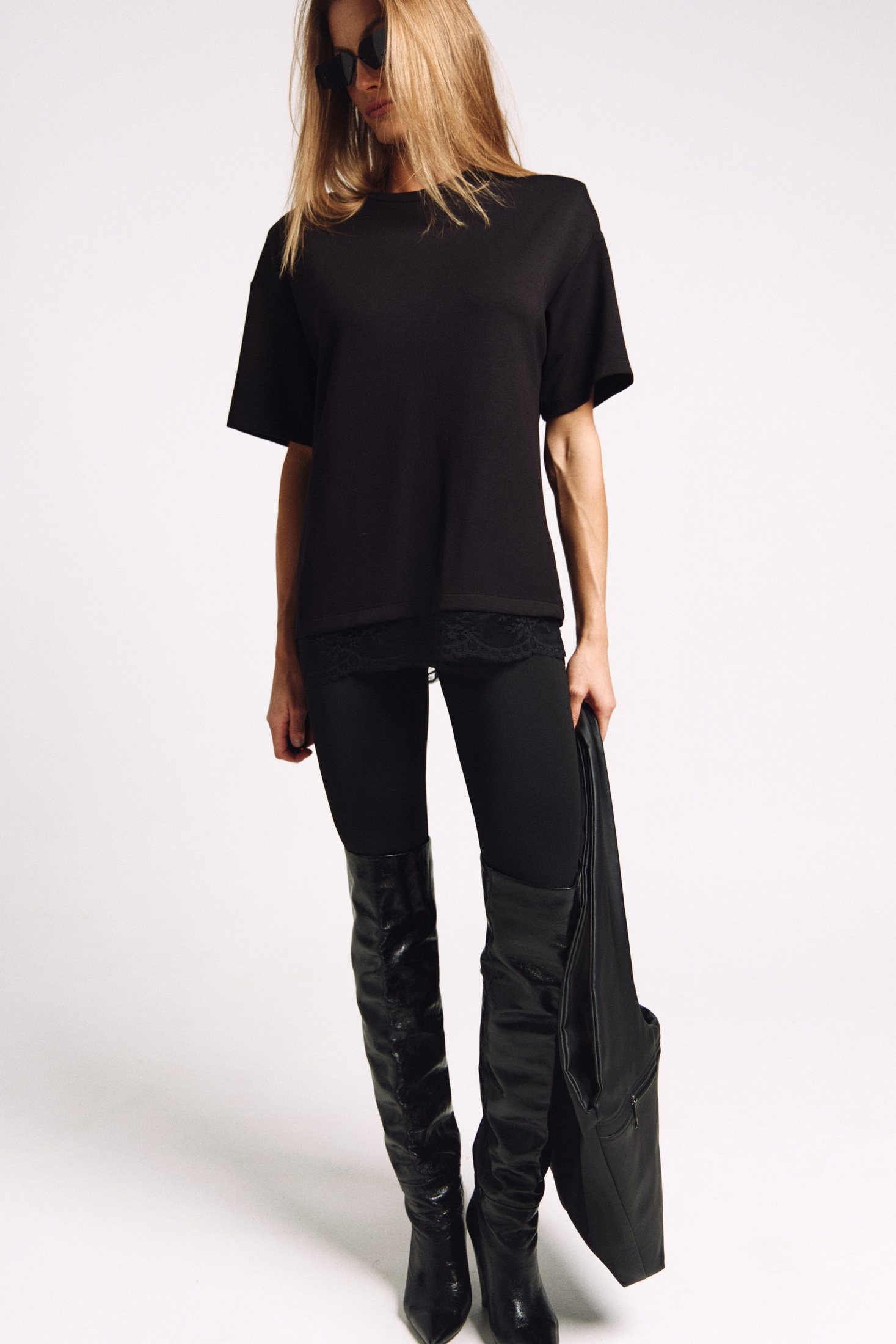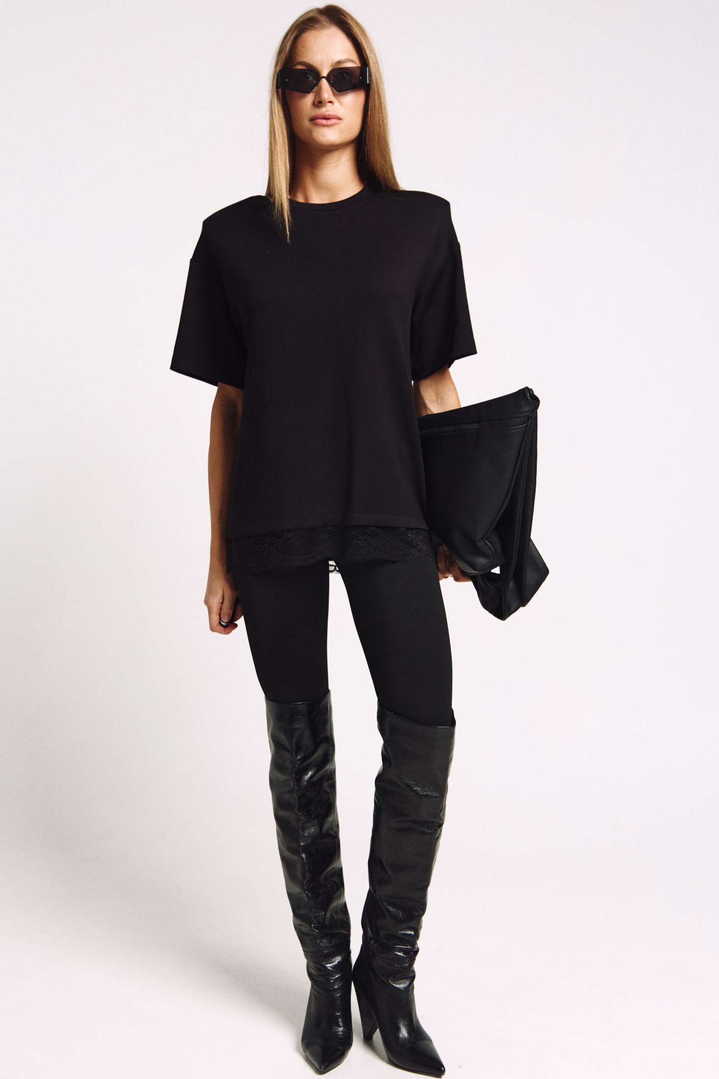 Футболка женская, удлиненная, из плотного трикотажа, с декоративными плечами и француским кружевом по низу.