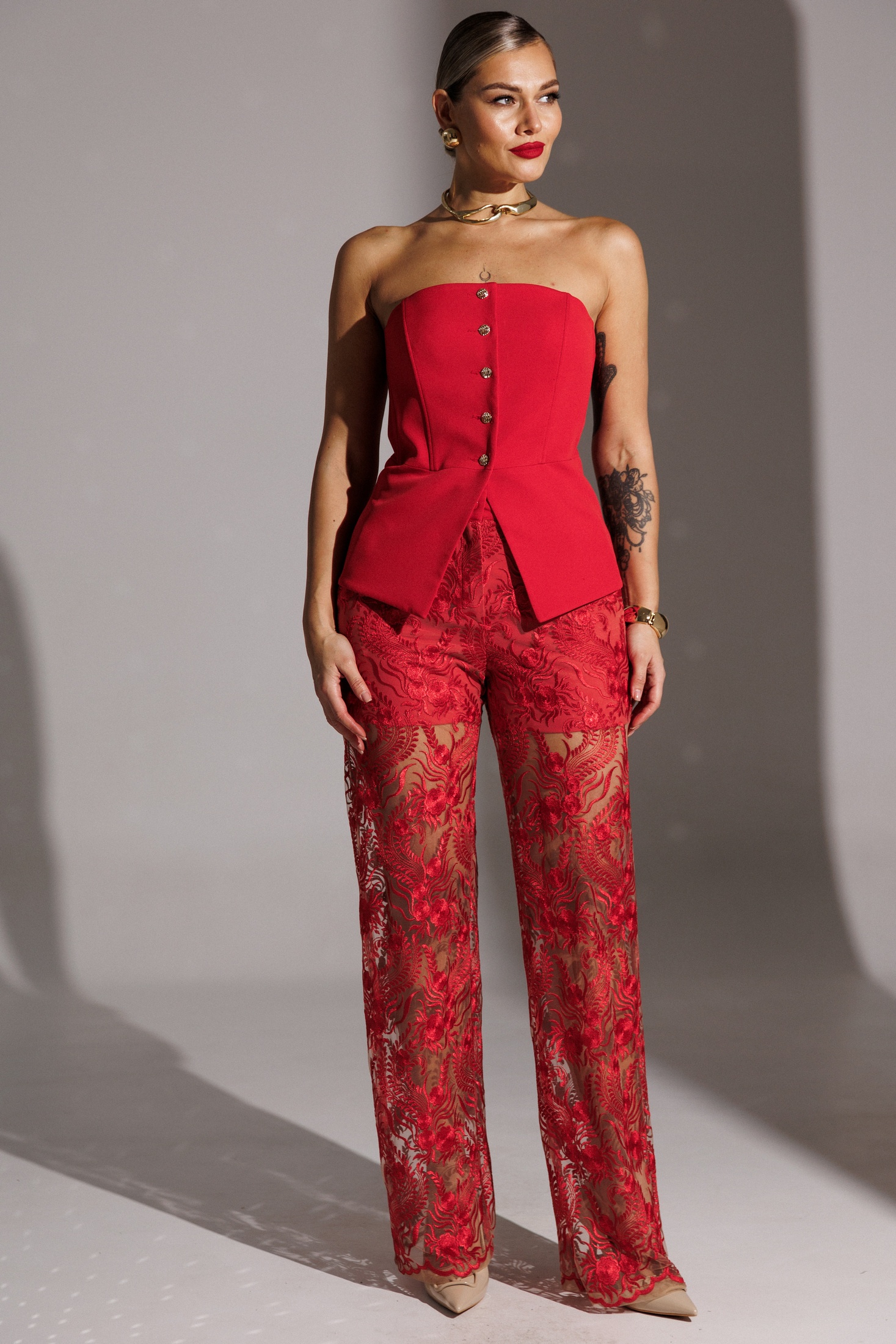 Капсула RED CODE - Ваша формула смелого праздника. Она создана для особых случаев включает в себя жакет, корсет и брюки, создавая элегантный и стильный образ. Корсет приталенного силуэта с центральной застежкой на пуговицы, идеально подчеркивающий фигуру и создающий элегантный контур. В вертикальные рельефы по переду и спинке, а также в боковые швы вставлен регилин, что обеспечивает дополнительную поддержку и формирует красивую линию талии. Низ корсета имеет фигурную форму, добавляя изысканности и утонченности. Корсет выполнен на подкладке, что гарантирует комфорт при носке и улучшает посадку на теле.