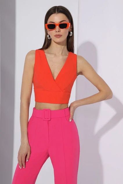 Топ выполнен из отделочной ткани, короткий, открытый, "V" - образный вырез по переду на запах, рельефы по переду, по низу – планка. По спинке – вытачки в центральной части, по низу планки расположена резинка (в притачной ткани). Отделкой комплекту служат пуговицы, отделочные строчки, шнур кулисы.