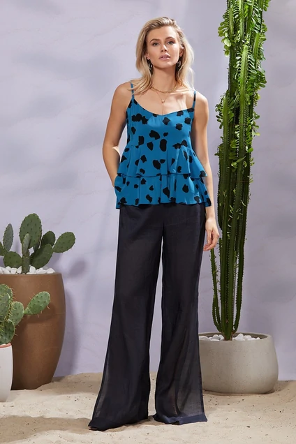 Топ из вискозы А-образного силуэта. Спереди и сзади изделия фигурный подрез, в который вставлены два волана. По спинке вставлена резинка для более удобной и комфортной носки.
