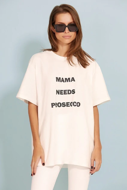 Футболка оверсайз выполнена из плотного хлопкового трикотажного полотна. Спущенная линия плеча. Короткий рукав. Горловина круглая с притачной планкой. Дизайнерский принт “MAMA NEEDS…..” (выполнен черным глитером- мелкие блестки) на передней половинке футболки.