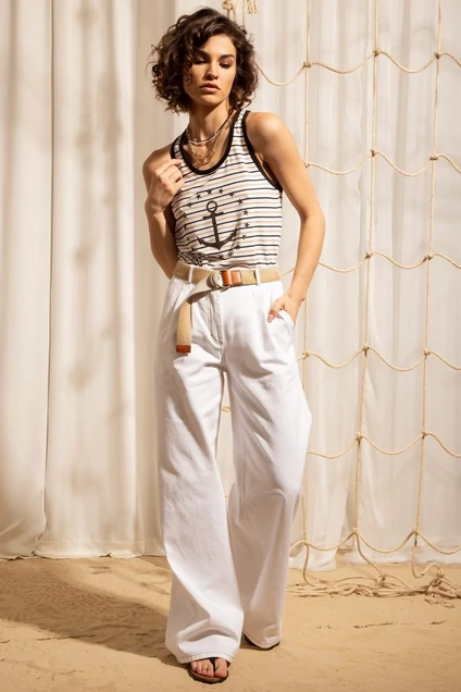 Джемпер из трикотажа в полоску с глубоким вырезом по переду. Вырез горловины и проймы обработан контрастными широкими окантовками. Джемпер дополнен декоративной печатью.