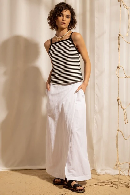Топ из трикотажа в полоску с окантовками с отделочной ткани бретелей, горловины и проймы.