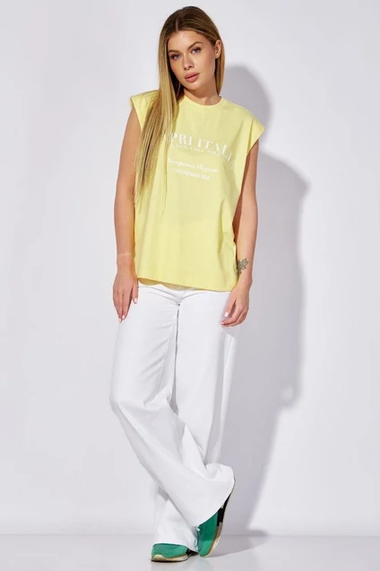 Женская футболка oversize яркого цвета прямого силуэта со спущенной линией плеча без рукавов с круглой формой горловины. На футболке дизайнерский принт.