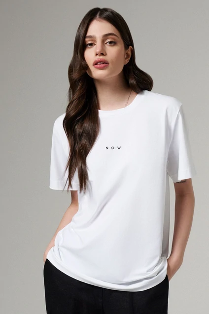 Футболка женская из хлопковой ткани для повседневной носки. Изделие прямого кроя с коротким втачным рукавом и круглой горловиной. По переду дизайнерский принт. Длина изделия классическая.