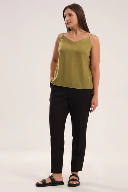 Лаконичный базовый топ из тонкой струящейся ткани. Топ полуприлегающего силуэта, с нагрудными вытчками по преду, на регулируемых бретелях. По переду треугольный вырез с декоративными планками.