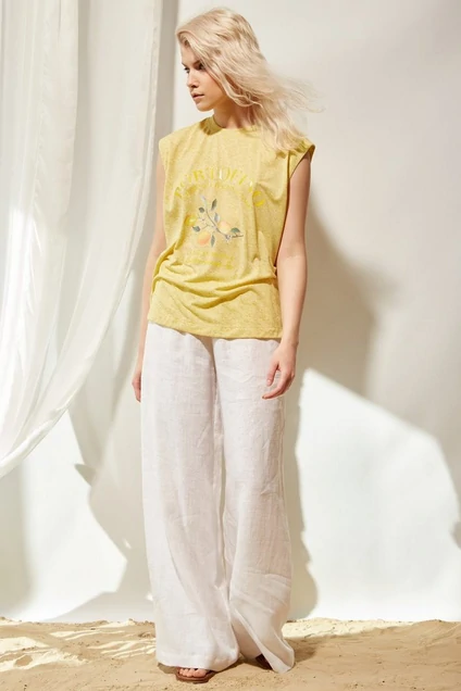 Футболка женская без рукавов в стиле oversize с дизайнерским принтом "лимоны". Горловина круглой формы. Футболка изготовлена из трикотажа с эффектом меланж в желтом цвете.
