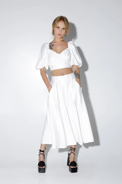 Текстильный топ с пышными рукавами и фигурным вырезом. Детали: глубокий кареобразный вырез, пышные короткие рукава, застежка на потайную молнию по спинке, топ на подкладке 100% хлопок.