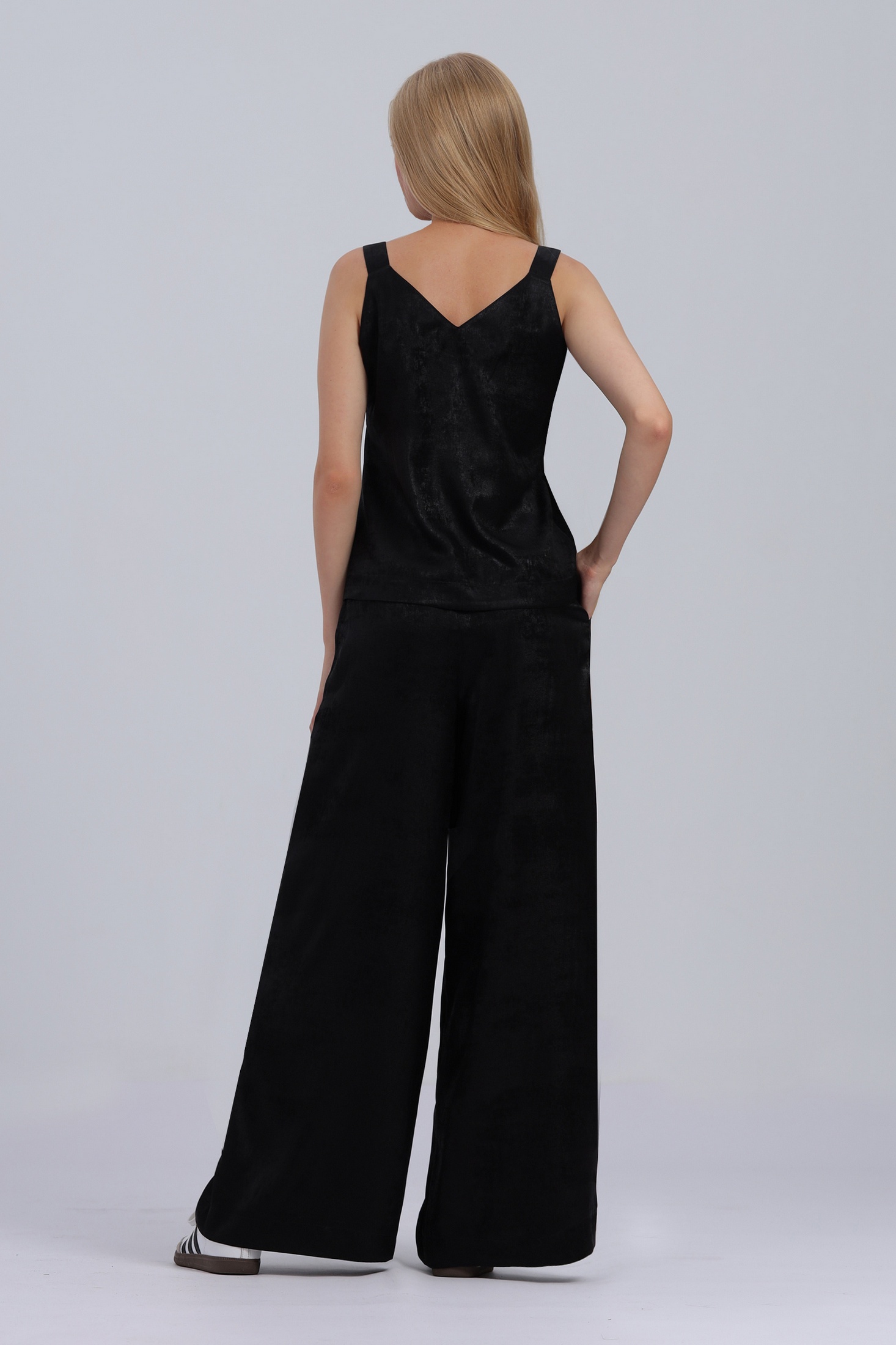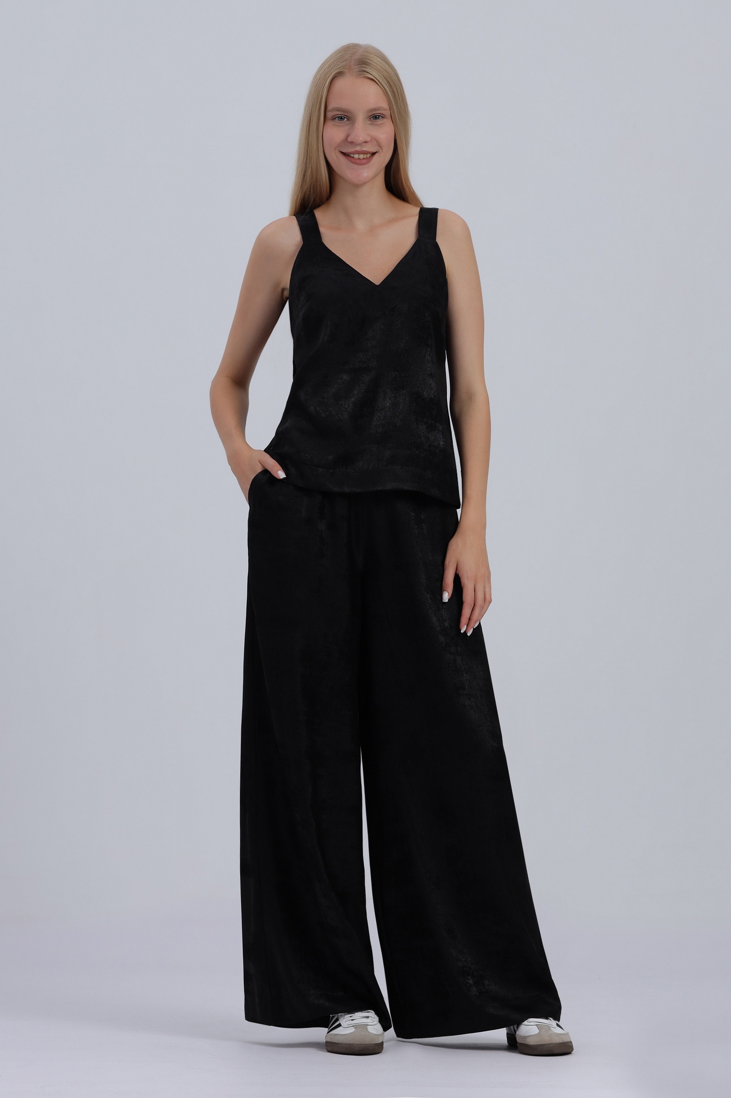 Базовый топ с V - образным вырезом незаменимый предмет вашего гардероба. Модель с полуприлегающим силуэтом. Стильный черный женский топ станет настоящей находкой для вашего гардероба. Широкие бретели обеспечивают комфорт. Этот вечерний топ под пиджак отлично подойдет для различных мероприятий, от деловых встреч до праздничных событий. Топик без рукавов привлекает внимание своим блестящим оттенком, который идеально дополняет вечерние наряды и создает стильный образ. Универсальность модели дает возможность использовать ее как базовую блузку.