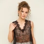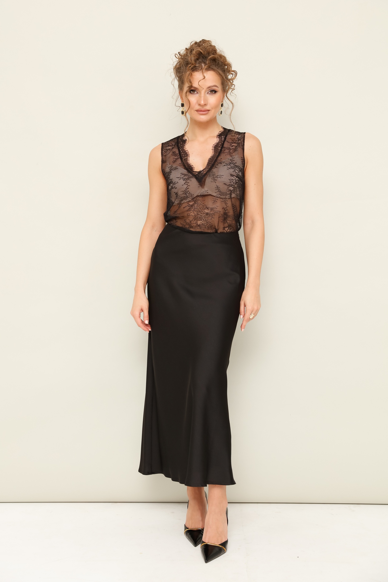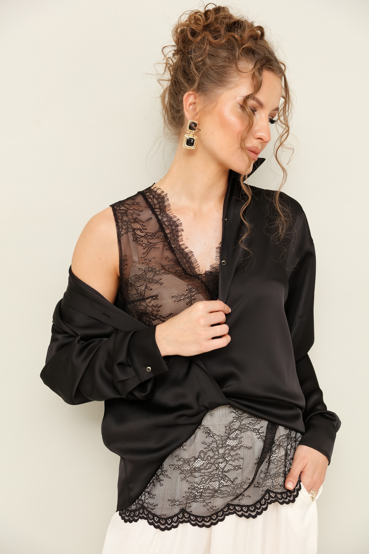 Элегантный топ прямого силуэта из изысканного французского кружева поразит вас своим винтажным шармом. Изделие окрашено в насыщенный черный цвет, который придает ему особую изысканность и глубину. Основной принт в виде тонкой кружевной вязки создает сложные и красивые узоры. V-образный вырез горловины, дополненный кружевной отделкой, подчеркивает шею и добавляет образу женственности. Этот стильный элемент делает топ идеальным выбором для торжественных событий или элегантных вечерних выходов.