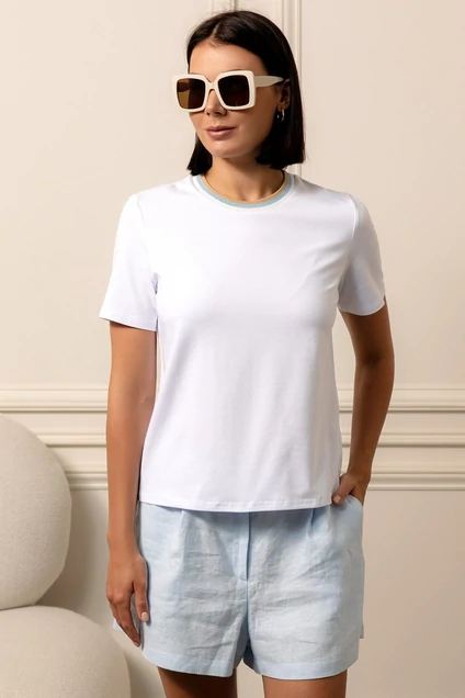 Джемпер полуприлегающего силуэта. Рукав втачной, короткий. Форма горловины - круглая, обработана притачной, отделочной бейкой . Низ изделия и рукавов обработаны на плоскошовной машине. Джемпер изготовлен из трикотажного полотна, в составе которого хлопок 94%, эластан 6%.