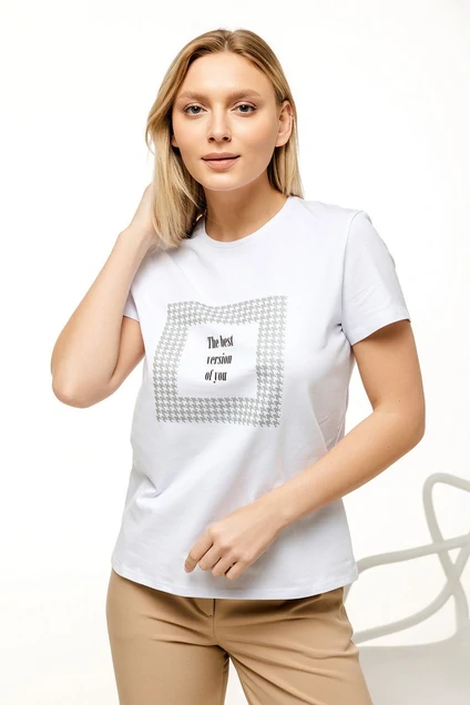 Джемпер полуприлегающего силуэта. Рукав втачной, короткий. Форма горловины круглая, обработана притачной бейкой с основного полотна. Низ изделия и рукавов обработаны на плоскошовной машине. По переду нанесена печать. Джемпер изготовлен из трикотажного полотна, в составе которого хлопок 94%, эластан 6%.
