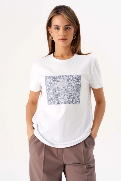 Эта стильная футболка с уникальным принтом — идеальный выбор для тех, кто хочет добавить в свой гардероб современности и элегантности. Она выполнена из мягкой и качественной ткани, обеспечивающей комфорт на протяжении всего дня.