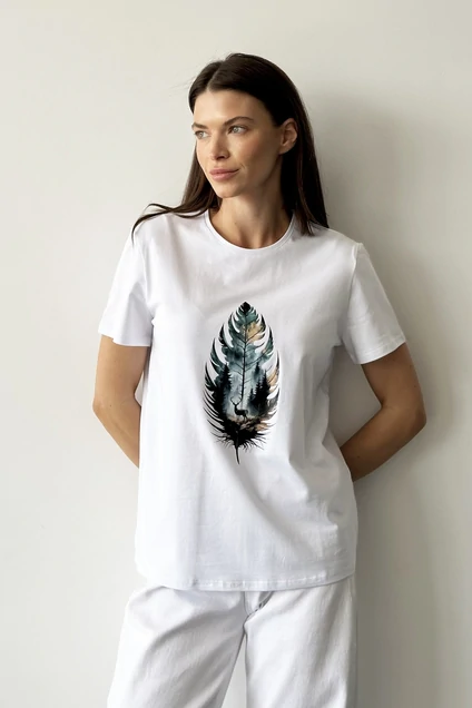 Уникальный принт с изображением пера добавляет изделию изысканности и индивидуальности.