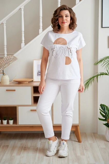 Футболка из трикотажной хлопковой ткани, со спущеным плечом. На полочке расположен цветной принт. Вырез горловины круглый, оформлен притачной бейкой.