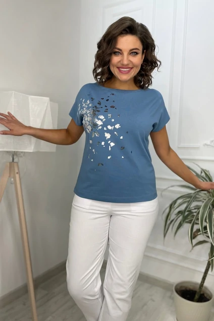 Футболка из трикотажной хлопковой ткани, со спущенным плечом. Перед футболки с принтом. Вырез горловины круглый, оформлен бейкой. Спинка со средним швом.