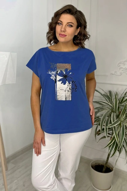 Футболка из трикотажной хлопковой ткани, со спущенным плечом. Перед футболки с принтом. Вырез горловины круглый, оформлен бейкой. Спинка со средним швом.