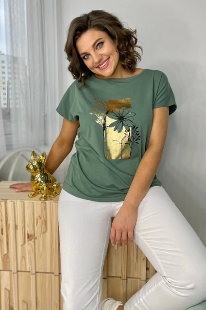 Футболка из трикотажной хлопковой ткани, со спущенным плечом. Перед футболки с принтом. Вырез горловины круглый, оформлен бейкой. Спинка со средним швом.