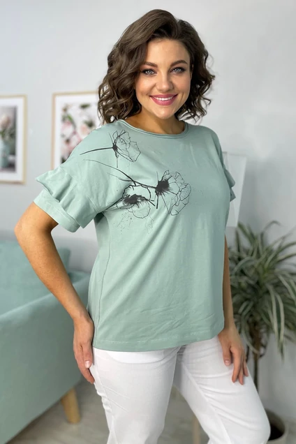 Футболка из трикотажной хлопковой ткани, со спущенным плечом. Перед футболки с принтом. Вырез горловины круглый, оформлен бейкой.В шов втачивания рукава,вставлен валан. Срез валана -не оработан. Спинка со средним швом.
