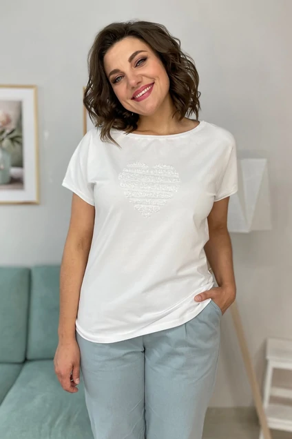 Футболка из трикотажной хлопковой ткани, со спущенным плечом. Перед футболки с вышевкой пайетками. Вырез горловины круглый, оформлен бейкой.