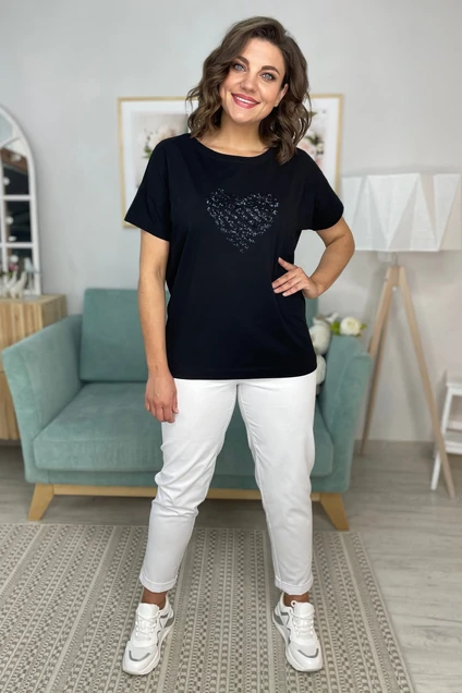Футболка из трикотажной хлопковой ткани, со спущенным плечом. Перед футболки с вышевкой пайетками. Вырез горловины круглый, оформлен бейкой.