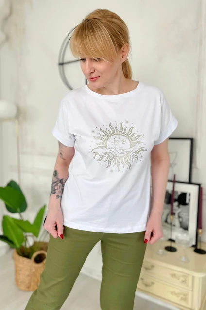 Футболка из хлопковой трикотажной ткани прямого силуэта. По переду расположен принт. Спинка со средним швом. Спущенное плечо обработанное манжетой. Вырез горловины-круглый, обработан бейкой.
