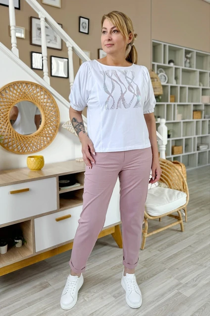 Футболка женский из трикотажной ткани. По переду расположен принт. По переду и спинке расположены рельефы. Рукав реглан со сборкой. Низ рукава обработан эластичной резинкой со сборкой. Вырез горловины лодочка.