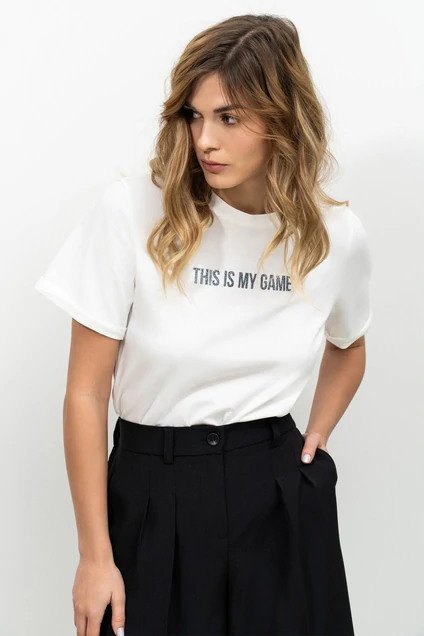 Футболка из хлопкового трикотажа с добавлением эластана. По горловине - бейка из основного материала, рукав втачной, с отложным манжетом. На полочке нанесен авторский принт блестящей фактуры. Стильная футболка - отличная база для повседневных образов. Длина изделия по спинке 60+-1 см. Длина рукава 20+-1 см.