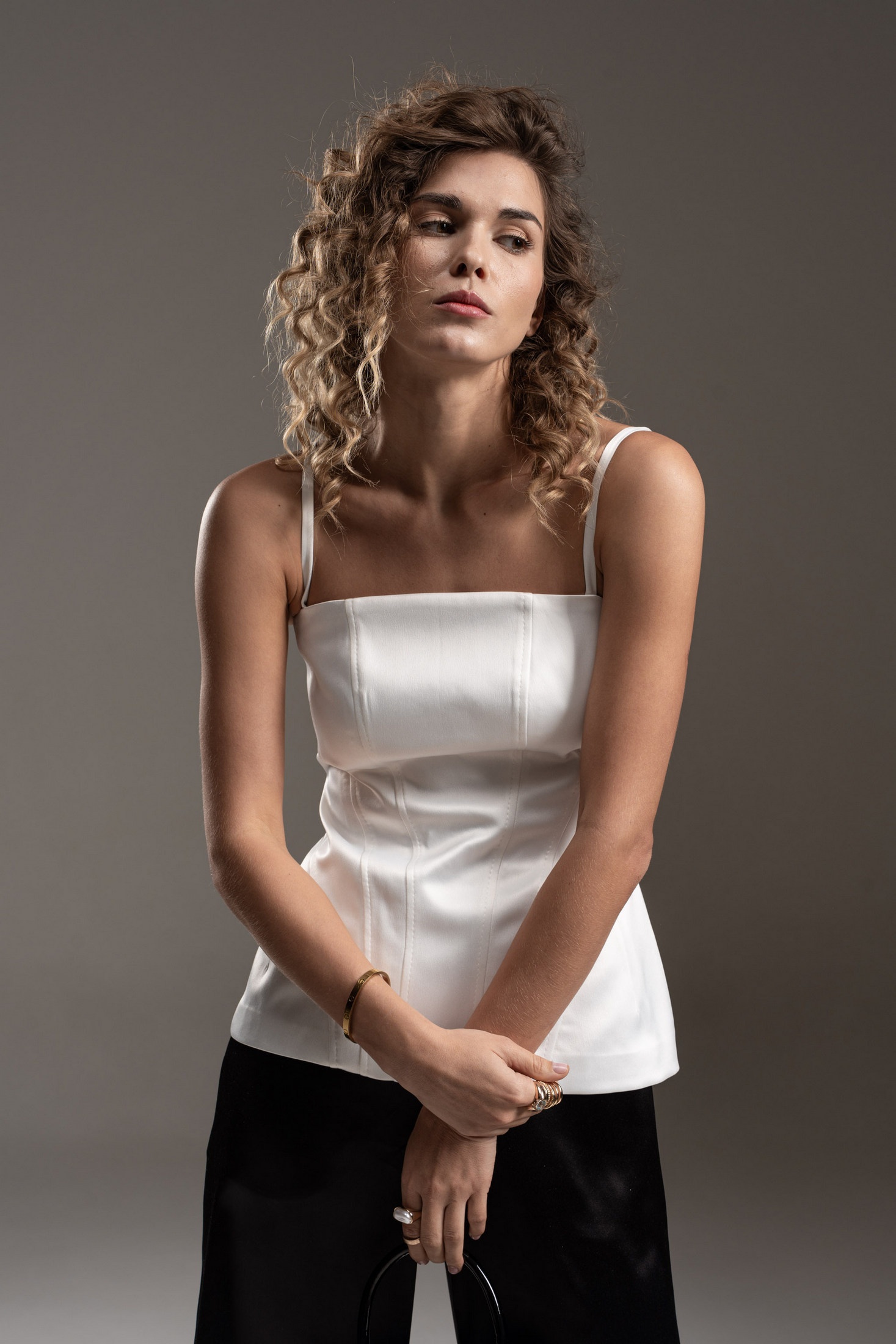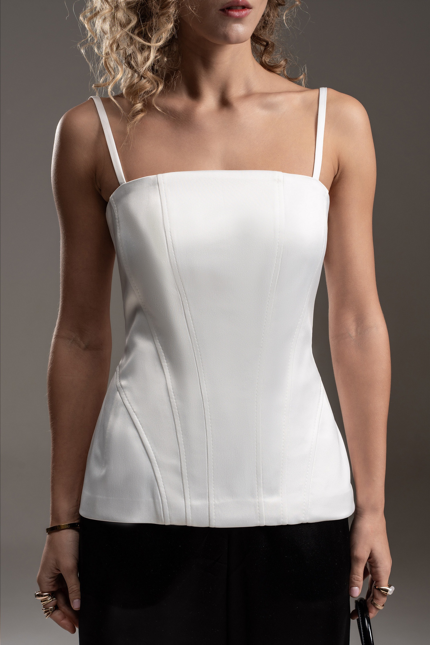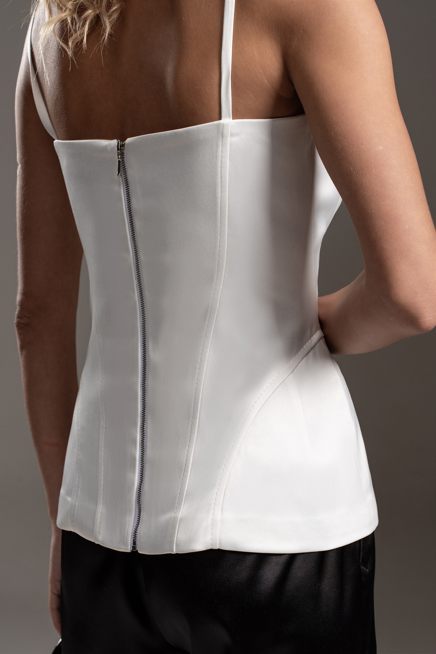 Удлиненный корсет из шелковистой ткани с деликатным сатиновым блеском. Корсет на бретелях. Застежка - разъемная металлическая молния в центральном шве спинки. Объемный крой на бедрах подчеркивается выверенными конструктивными линиями. Силуэт "песочные часы" подчеркивает женственность. Корсет как модный тренд можно использовать в самых разных стилях: повседневном, деловом и вечернем.