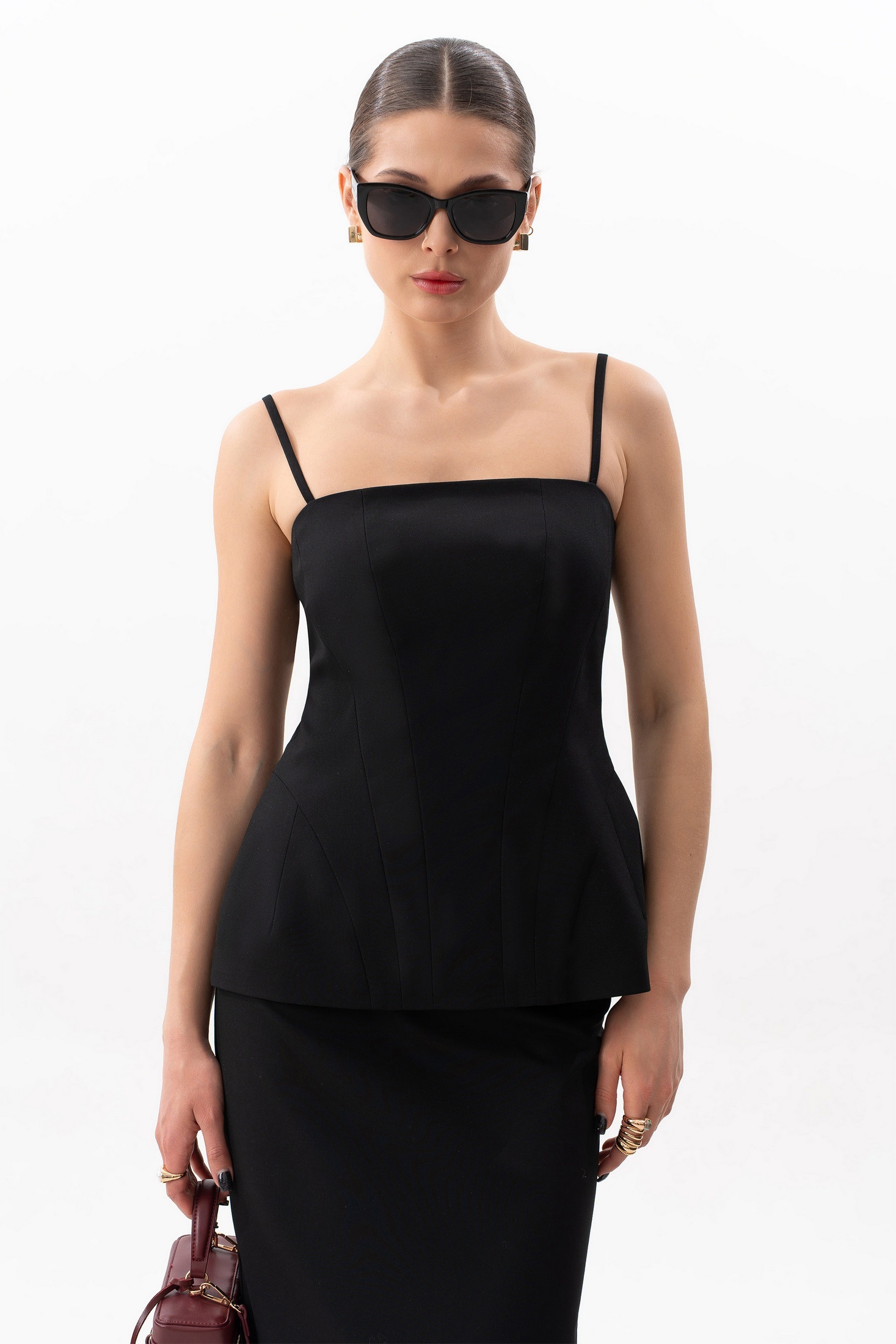 Удлиненный корсет на подкладке с регулируемыми брителями. Застежка - разъемная металлическая молния в центральном шве спинки. Объемный крой на бедрах подчеркивается выверенными конструктивными линиями. Силуэт "песочные часы" подчеркивает женственность. Корсет как модный тренд можно использовать в самых разных стилях: повседневном, деловом и вечернем. На фото: брюки S-3630, юбка S-4616