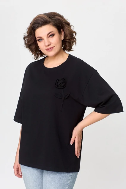 Джемпер прямого силуэта с втачным спущенным рукавом. По левой части переда объемный цветок в тон. Горловина обработана бейкой. Низ футболки и рукавов обработаны на плоскошовной машине. Шов втачивания горловины с отсрочкой.