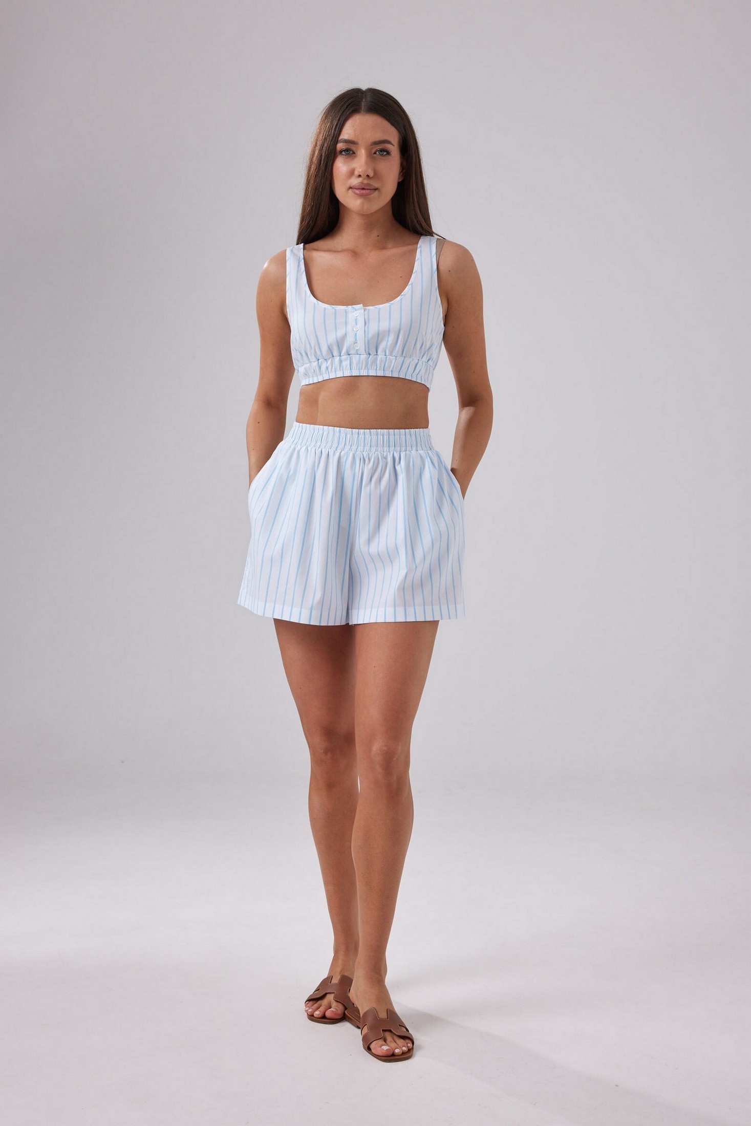 Укороченный женский топ без рукавов, выполнен из хлопкового полотна. Горловина углублена. По центру застежка на петли и пуговицы. По низу топа вставлена эластичная резинка.