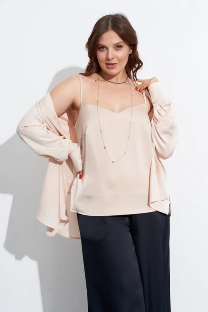 Просторный топ на регулируемых бретелях. Спереди обработаны нагрудные вытачки. В боковых швах небольшие разрезы. Изделие на подкладке.