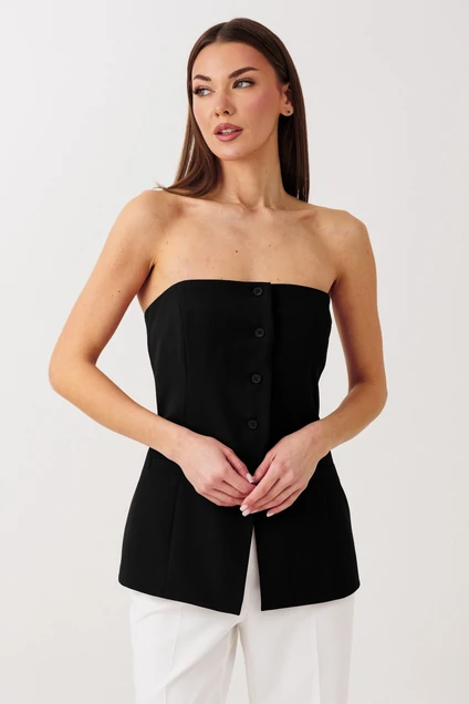 - выполнен из костюмной ткани, -открытые плечи, -по передней части изделия петли-пуговицы.