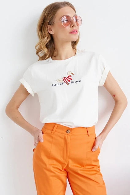 Футболка женская. Полуприлегающего силуэта. Выполнена из высококачественного трикотажа. Рукав втачной, короткий, низ обработан на спецмашине.