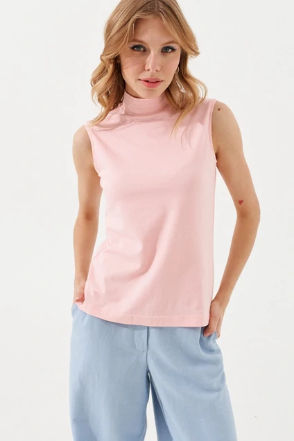 Топ женский, полуприлегающий. Горловина на невысокой стойке. Низ изделия обработан на спецмашине.
