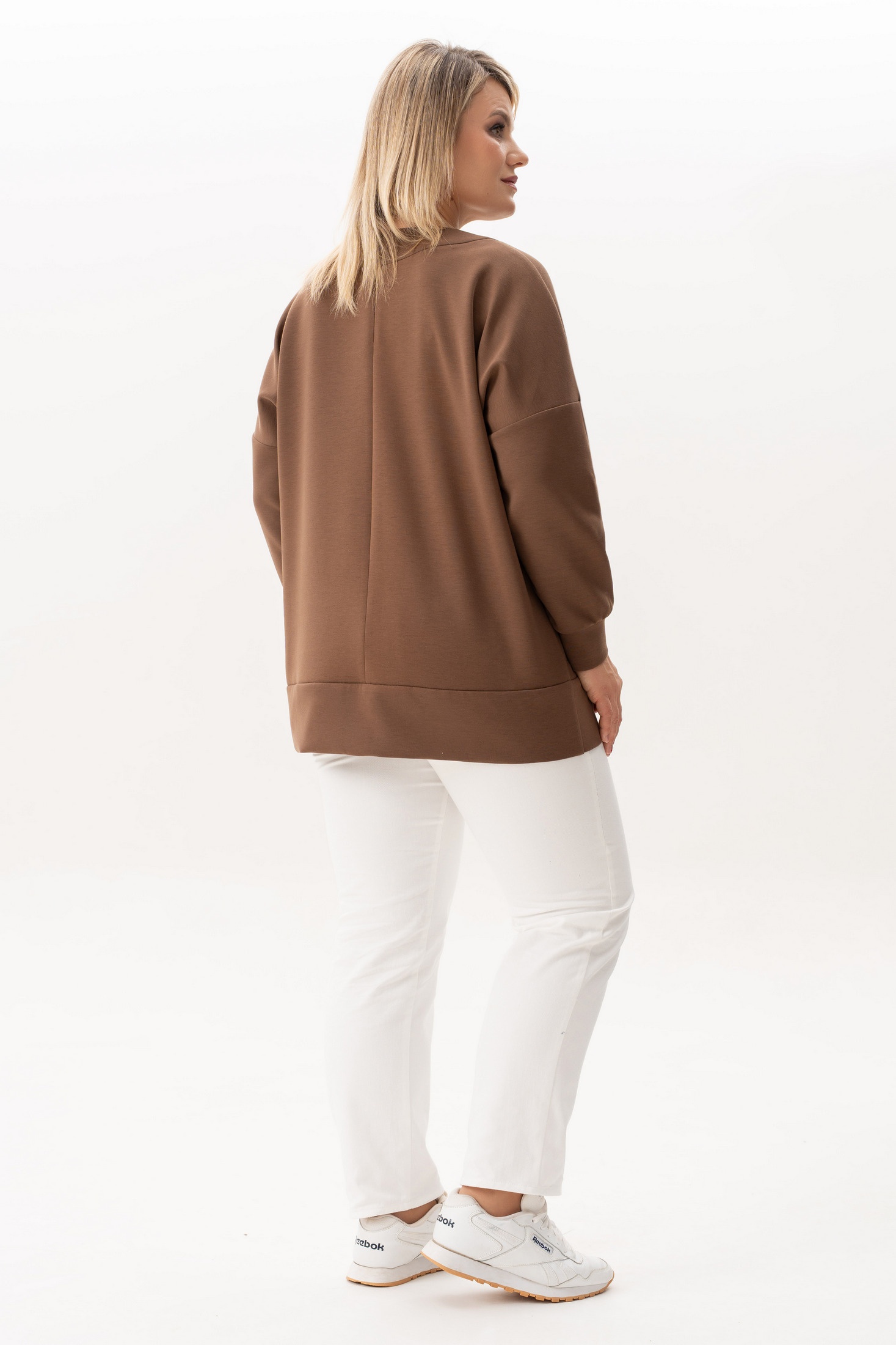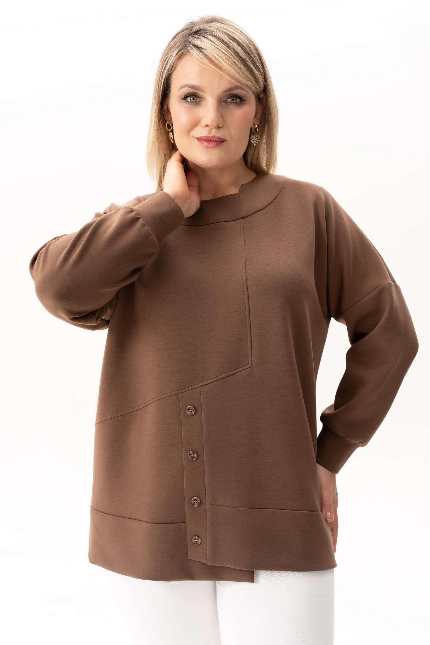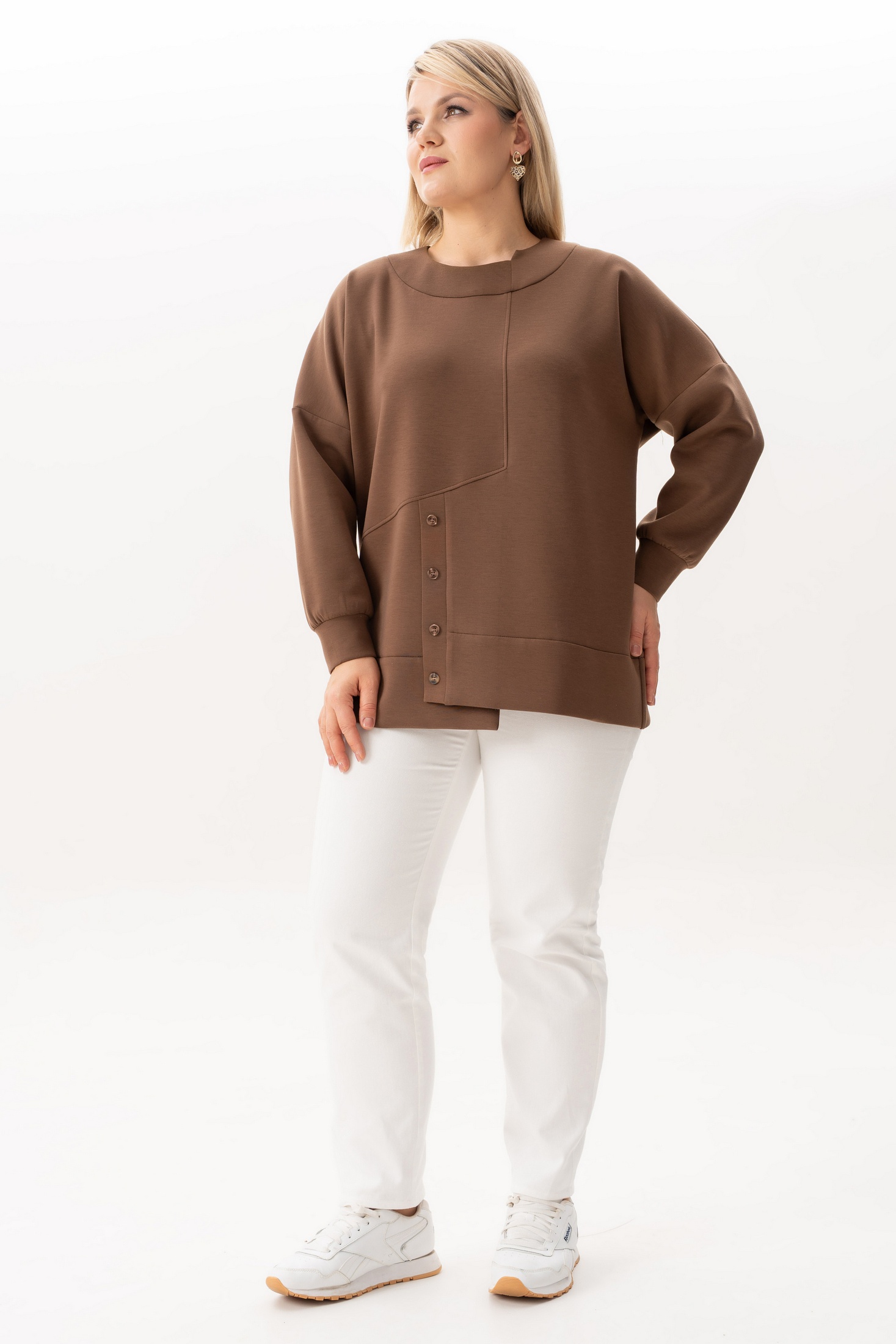 Позвольте себе насладиться комфортом и стилем с нашей туникой, которая станет вашим незаменимым спутником. Этот стильный свитшот предполагает легкость и свободу движений, что делает идеальным для повседневной носки и прогулок на свежем воздухе. Изготовленный из качественного трикотажа, он обеспечивает дышащие свойства и гипоаллергенность, что особенно важно для женщин с чувствительной кожей. Туника с круглой, асимметричной горловиной и манжетами на запястьях добавляет образу женственности и утонченности. На полочке обработана нефункциональная, декорированная пуговицами планка. На спинке, в среднем шве, обработана потайная молния.Она легко сочетается с различными аксессуарами,юбкой,брюками и разной обувью, что дает возможность создавать разнообразные образы. Длина рукава (см):62 Длина блузы (см):74