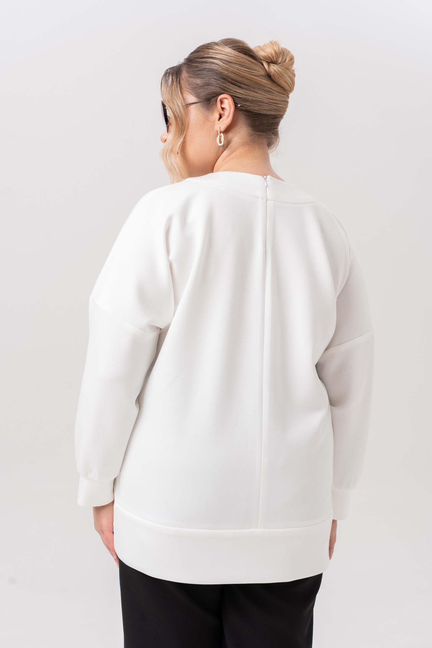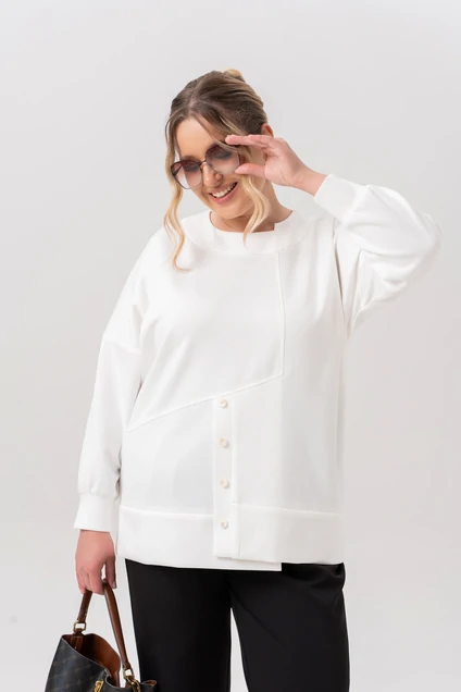 Позвольте себе насладиться комфортом и стилем с нашей туникой, которая станет вашим незаменимым спутником. Этот стильный свитшот предполагает легкость и свободу движений, что делает идеальным для повседневной носки и прогулок на свежем воздухе. Изготовленный из качественного трикотажа, он обеспечивает дышащие свойства и гипоаллергенность, что особенно важно для женщин с чувствительной кожей. Туника с круглой, асимметричной горловиной и манжетами на запястьях добавляет образу женственности и утонченности. На полочке обработана нефункциональная, декорированная пуговицами планка. На спинке, в среднем шве, обработана потайная молния.Она легко сочетается с различными аксессуарами,юбкой,брюками и разной обувью, что дает возможность создавать разнообразные образы.