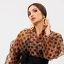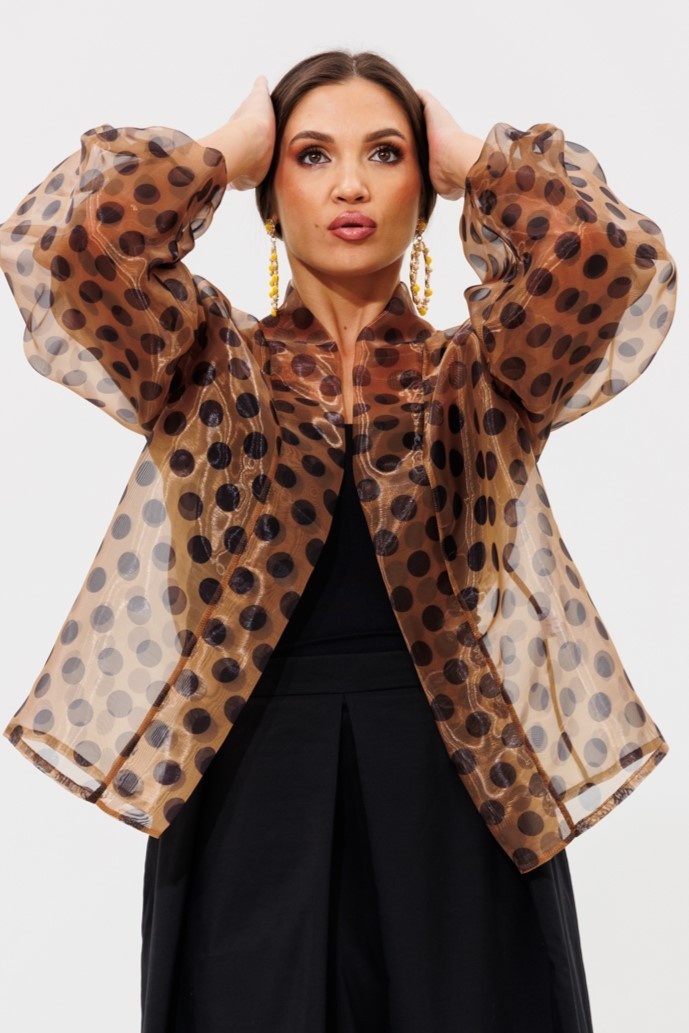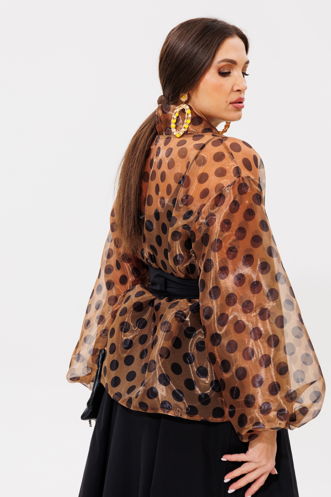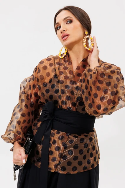 Туника женская прямого силуэта из органзы и со спущенной линией плеча. С ее помощью легко можно трансформировать повседневный образ в праздничный. Идеально сочетается с брюками, юбкой, платьем. Рукав двойной, расширенный к низу со складками. По спинке и полочке идет планка. В комплекте с туникой идет съемный пояс. Длина спинки(48-56)-66 см.