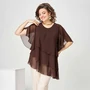 Туника женская нарядно-повседневная, свободного силуэта из летящей блузочной ткани. Горловина круглая, рукав три четверти, на манжету с пуговицами. Рукав расширен к низу на сборку. Перед с фигурной кокеткой, из-под кокетки асимметричная деталь переда со складками. Нижняя деталь переда с прямым низом, верхняя с диагональным срезом. Спинка свободная. К изделию прилагается декоративный съемный цветок.