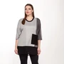 Туника женская А-силуэта из трикотажа с добавлением спандекса, со спущенным рукавом. Полочка двухцветная выполнена на контрасте цветов, фигурный низ: перед короче, по бокам длиннее. Полочка украшена аппликациями в цветочной тематике.