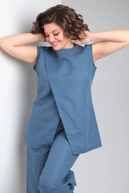 Горловина в форме лодочки. Полочка асимметричная на запах, застежка на петли и пуговицы по плечу. Наполочке нагрудные вытачки. Пройма окантована. Спинка с центральным швом и талиевыми вытачками.